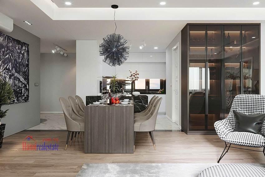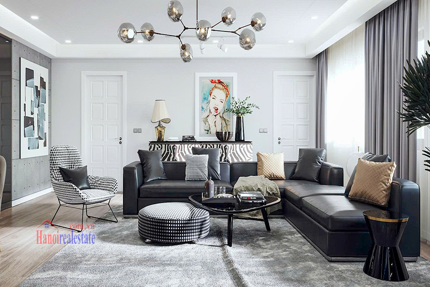 For rent: High-floor apartment in E4 Ciputra, Hanoi, with 2 bedrooms, 2 bathrooms, and modern furnishings.