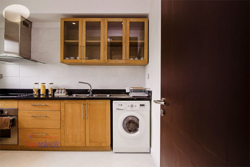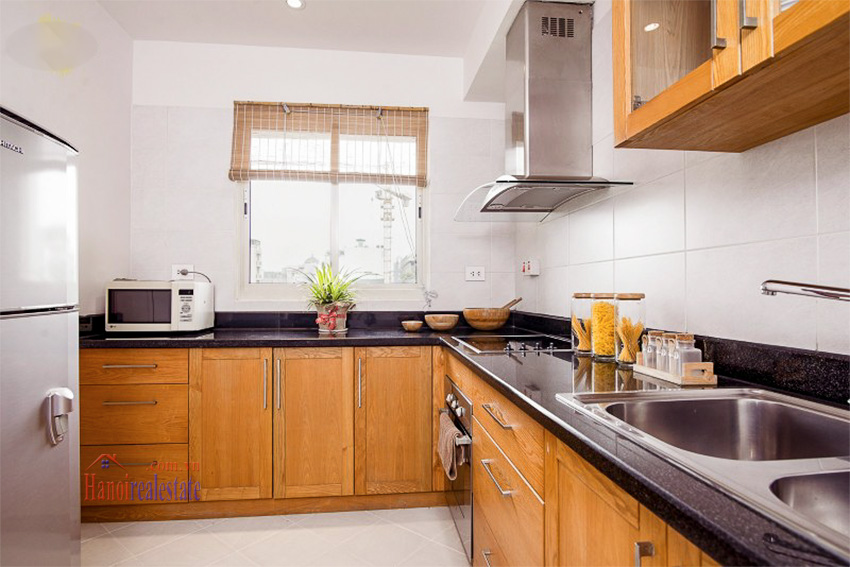 Tiện nghi phòng bếp: Hệ thống bếp chữ L khép kín với mặt đá granite đen, trang bị đầy đủ bếp từ, lò nướng, lò vi sóng, tủ lạnh dung tích lớn và máy giặt/sấy tích hợp.