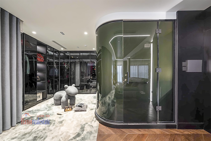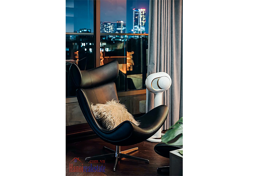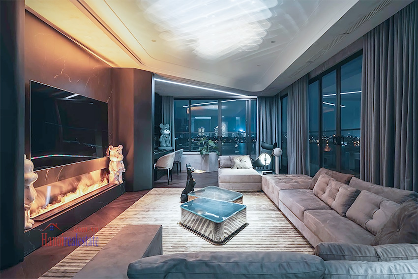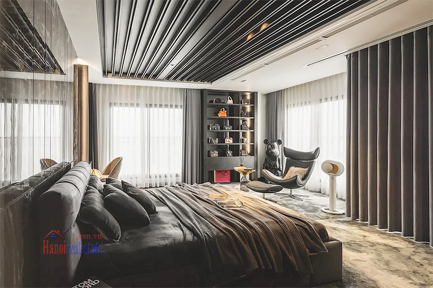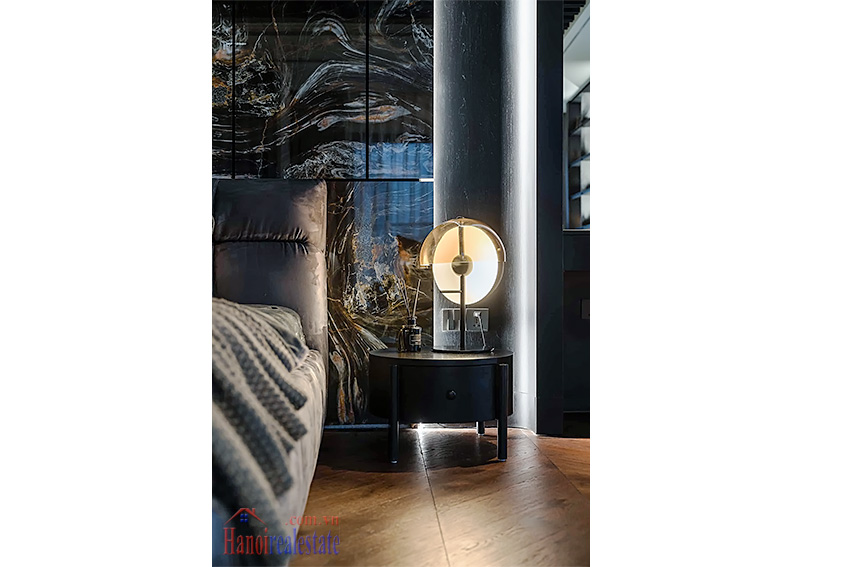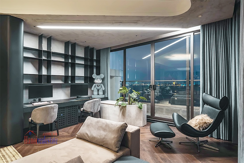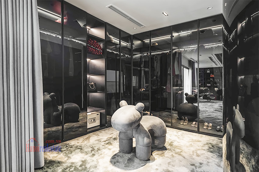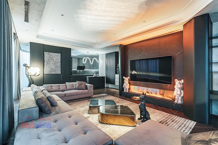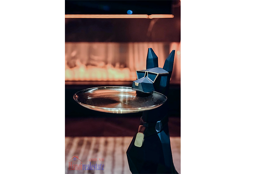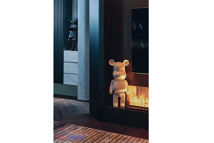 Với phong cách thiết kế tông màu tối chủ đạo, kết hợp ánh sáng âm trần và các món đồ trang trí nghệ thuật (như mô hình Bearbrick), căn hộ mang đến trải nghiệm sống khác biệt và riêng tư tại khu vực Hồ Tây.