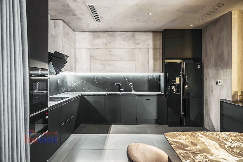 Thiết bị bếp: Tủ lạnh side-by-side, lò nướng, lò vi sóng, bếp điện và hệ thống hút mùi. Các vật dụng nhỏ như đĩa, dao, nĩa cũng được cung cấp sẵn.