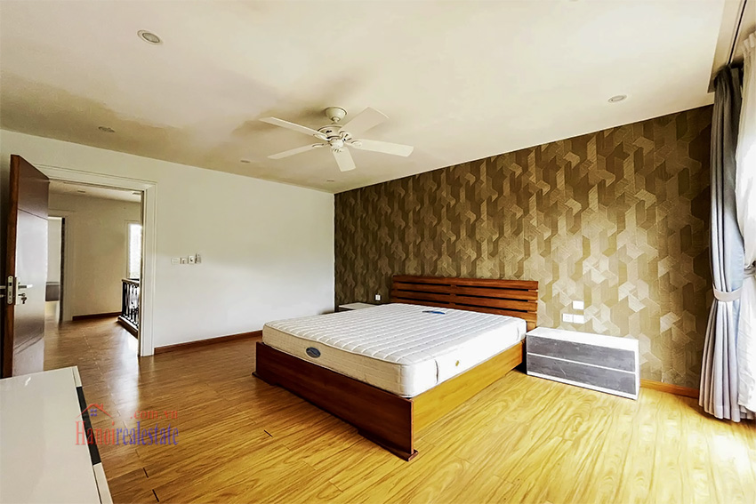 Phòng ngủ: Gồm 3 phòng ngủ chính và 4 phòng vệ sinh. Phòng ngủ master có sàn gỗ, đi kèm khu vực thay đồ riêng biệt với hệ tủ trắng kịch trần và bàn trang điểm lớn.