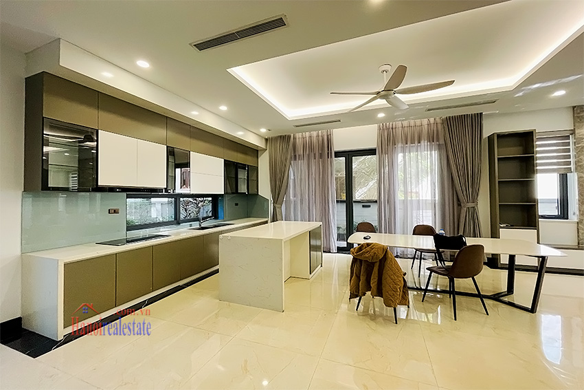 Khu vực bếp có sẵn tủ bếp hiện đại, bàn đảo và các thiết bị bếp cơ bản.