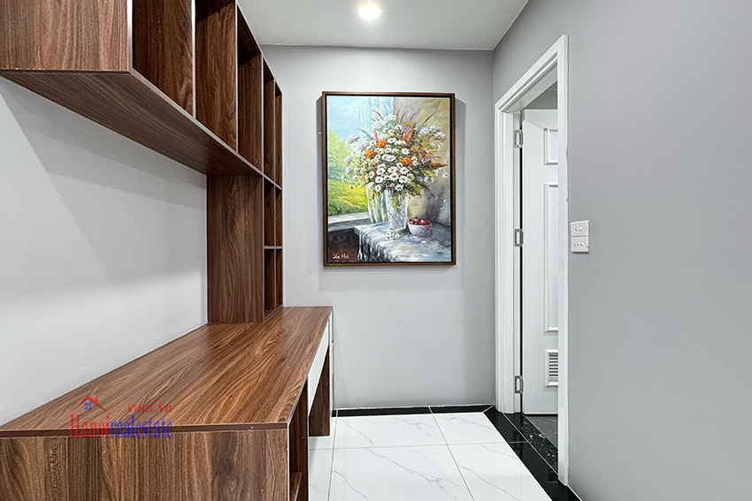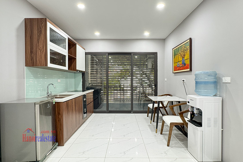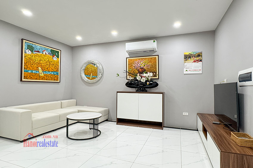 This newly completed 1-bedroom apartment, spanning 45m2, is located on Au Co Street. It is fully furnished with modern amenities. The apartment features a spacious living room with comfortable seating, a fully equipped kitchen with appliances such as a refrigerator, stove, and microwave.