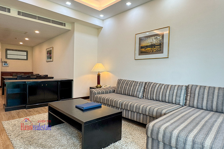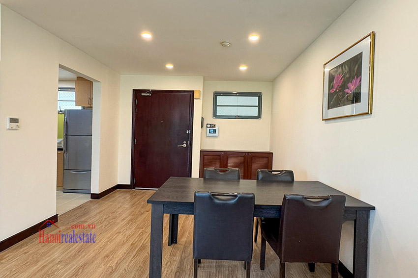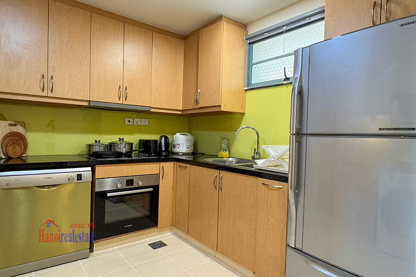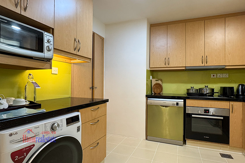 This apartment is composing of a cozy living room combining with dining room. The kitchen is separated and equipped with dishwasher, induction, ventilation. This apartment is fully furnished with modern style of wooden furniture.