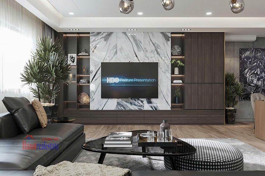 For rent: High-floor apartment in E4 Ciputra, Hanoi, with 2 bedrooms, 2 bathrooms, and modern furnishings.