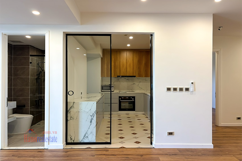 This apartment for rent in Ciputra is provided with essential wall-mounted fixtures. The kitchen area is a highlight, designed with a modern L-shaped cabinetry system, marble-patterned countertops, and integrated appliances including an induction hob, oven, and a large side-by-side refrigerator.