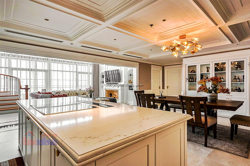 Bếp mở hiện đại, trang bị đầy đủ thiết bị nhập khẩu cao cấp.
