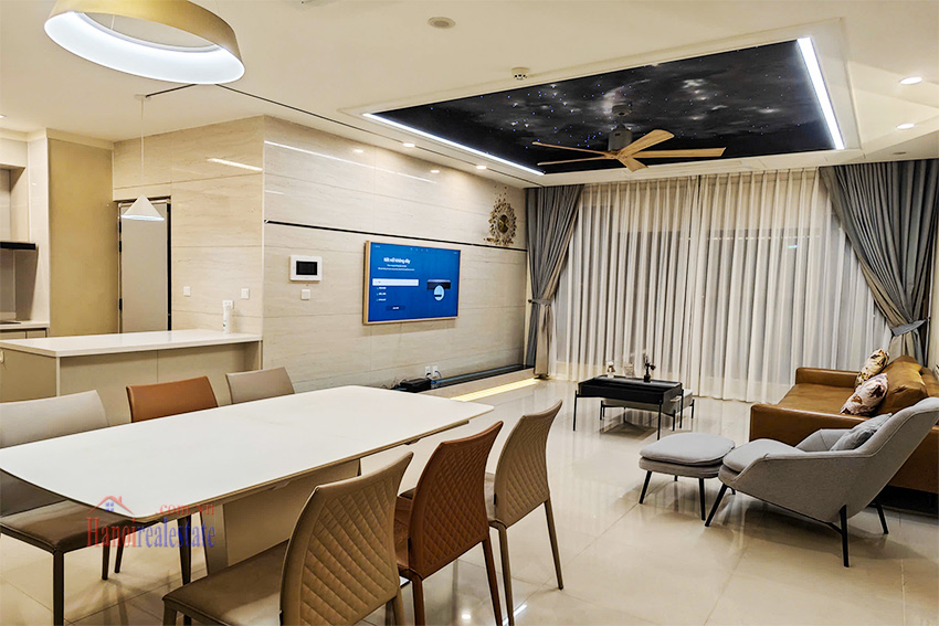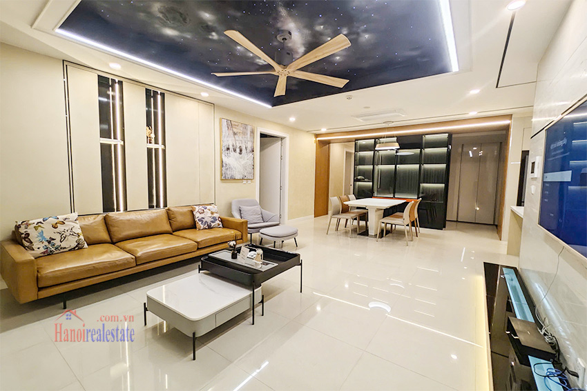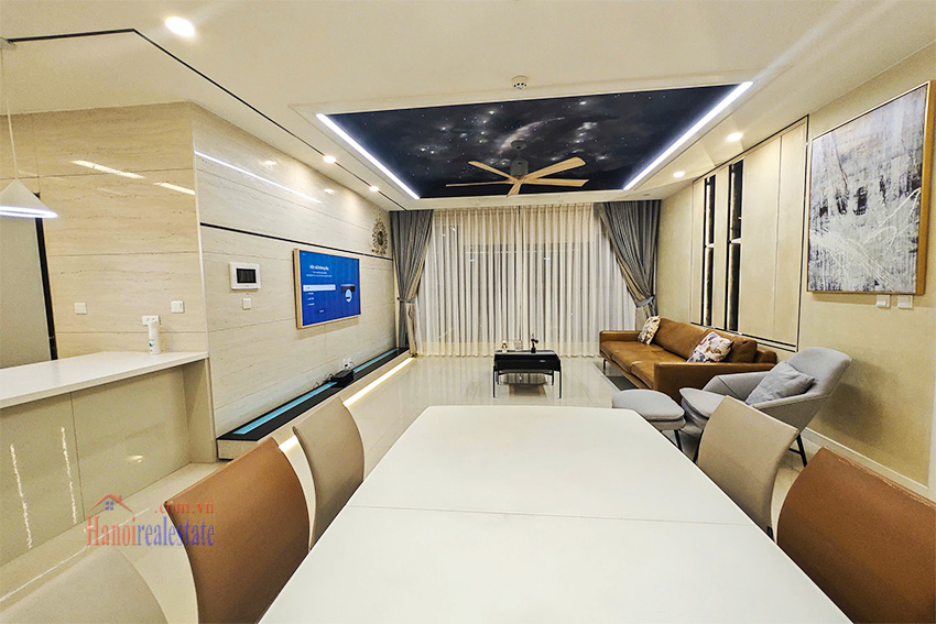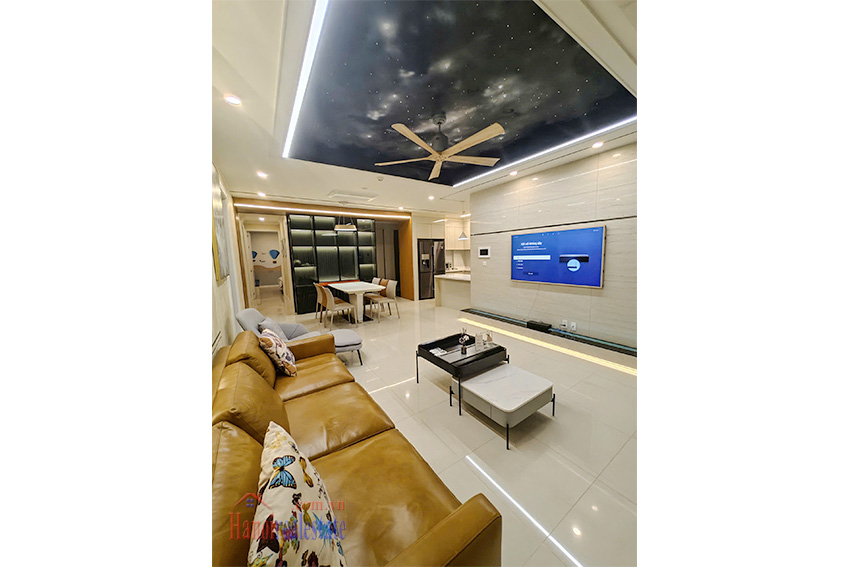 1. Không gian sinh hoạt chung rộng lớn Điểm nhấn của căn hộ là khu vực phòng khách và phòng ăn liên thông có diện tích lên tới gần 48m². Trần nhà được trang trí họa tiết dải ngân hà độc đáo kết hợp quạt trần hiện đại. Hệ thống cửa kính lớn dẫn ra logia chính giúp không gian luôn tràn ngập ánh sáng tự nhiên. Nội thất phòng khách bao gồm sofa da màu nâu sang trọng và kệ tivi thiết kế tối giản.