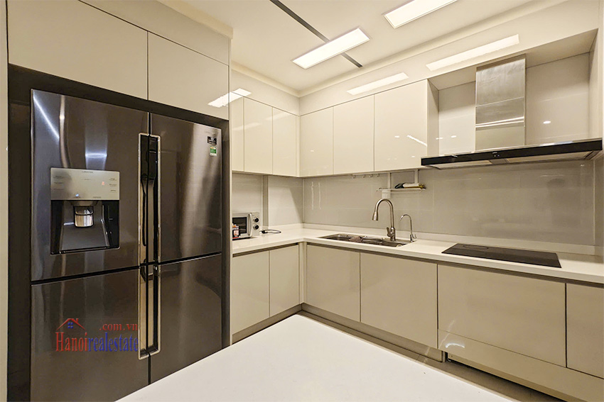 2. Khu bếp và Logia phụ Bếp được thiết kế dạng đóng (có cửa ngăn), giúp hạn chế mùi thức ăn bay ra phòng khách. Khu vực này được trang bị hệ tủ bếp bóng gương, bếp từ, hút mùi và tủ lạnh dung tích lớn. Đặc biệt, bếp nối liền với logia thứ 2 - nơi đặt máy giặt, máy sấy và giàn phơi, đảm bảo sự thông thoáng đối lưu không khí.