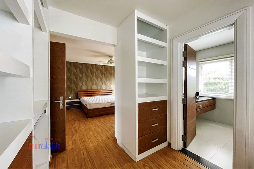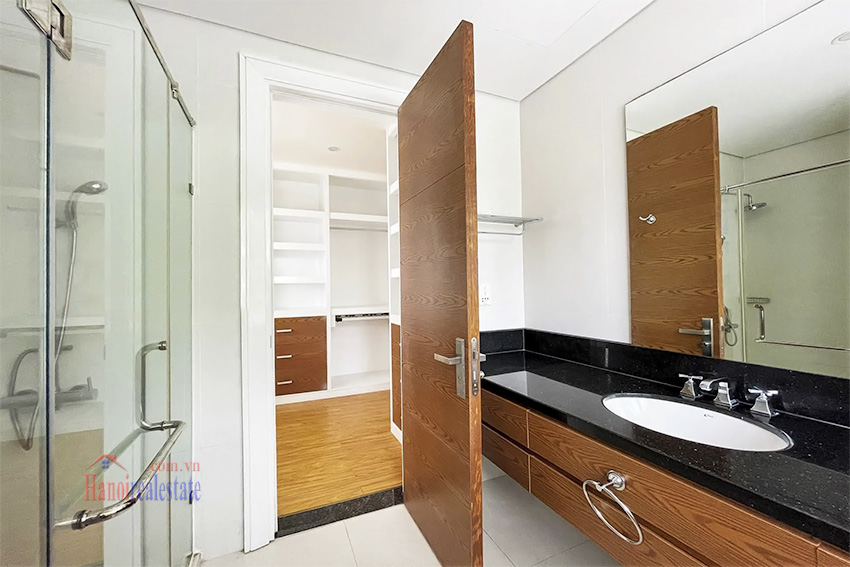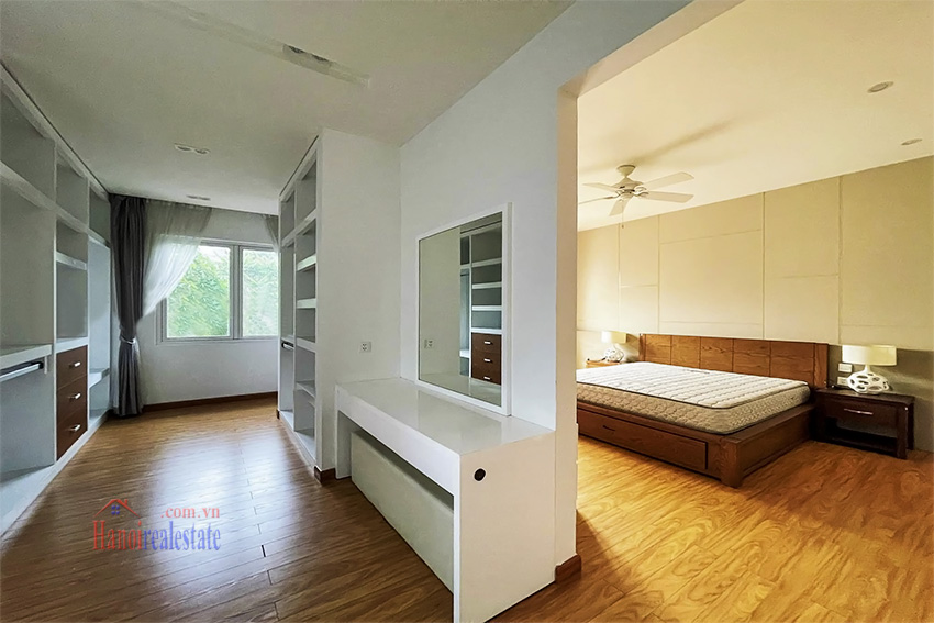 Phòng ngủ: Gồm 3 phòng ngủ chính và 4 phòng vệ sinh. Phòng ngủ master có sàn gỗ, đi kèm khu vực thay đồ riêng biệt với hệ tủ trắng kịch trần và bàn trang điểm lớn.