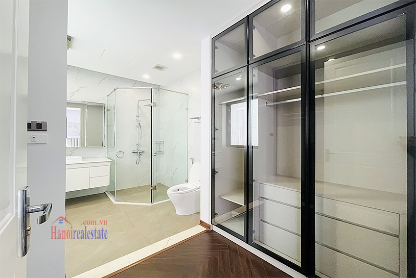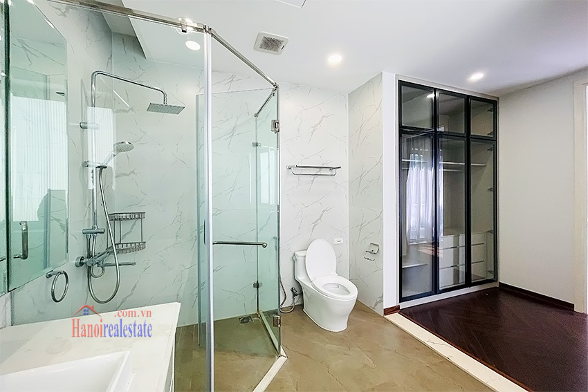 Phòng vệ sinh sạch sẽ với vách tắm kính đứng và thiết bị vệ sinh cao cấp.