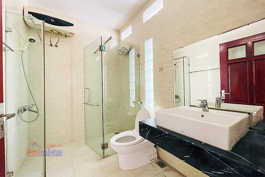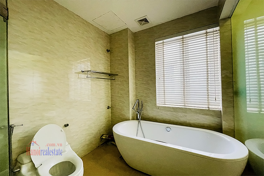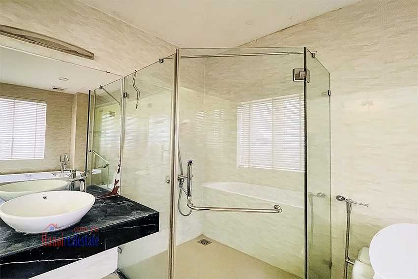 The bathrooms are modern and functional. They include glass-enclosed standing showers to keep the space dry. The master bathroom is upgraded with a freestanding oval bathtub and large windows with blinds, ensuring both privacy and ventilation.