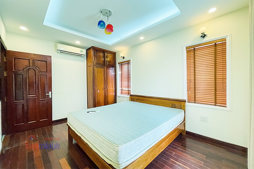 The villa houses four bedrooms distributed across the upper floors. The bedrooms feature hardwood flooring and are equipped with essential furniture including beds, wardrobes, and air conditioning units. The master bedroom layout is generous, allowing for additional seating or workspace.