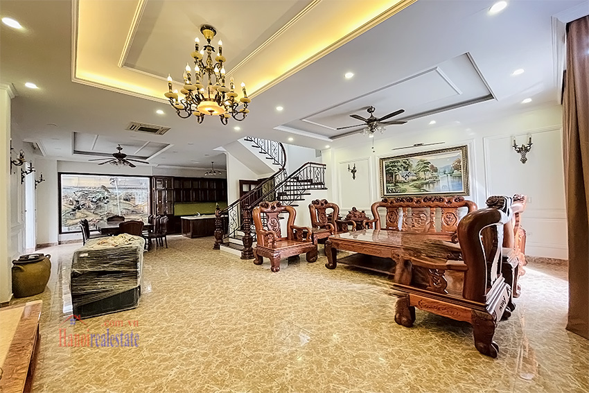 The ground floor features an open-plan design that maximizes the 156m² footprint. The living room is furnished with a substantial, classic wooden sofa set and a detailed chandelier, offering a formal reception space. Large glass windows provide natural light and views of the surrounding neighborhood.